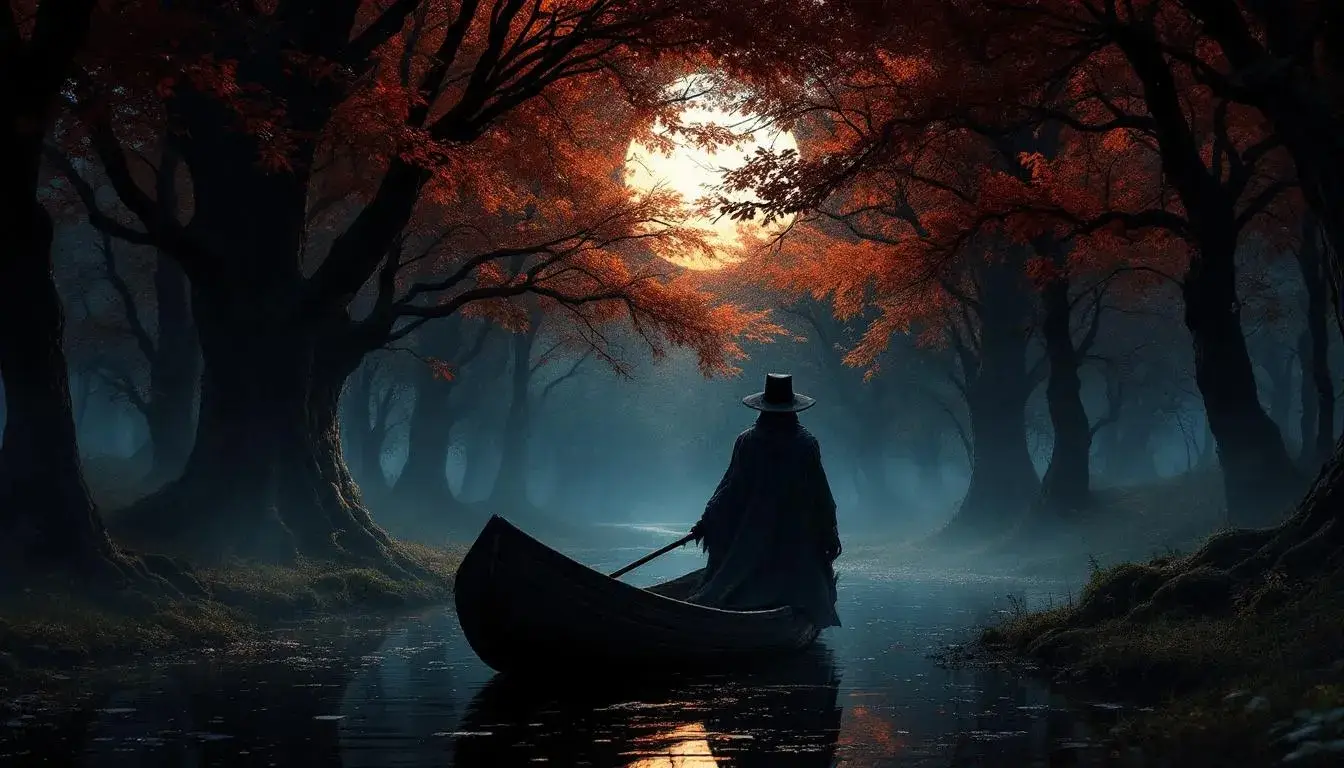 Whether it was due to the slanting sunlight, or the refraction from the wonderfully illumined water, I cannot say, but, whatever the cause, I found it difficult to focus my sight properly upon the flying apparition. It seemed, however, to be a man standing upright in a sort of flat-bottomed boat, steering with a long oar, and being carried down the opposite shore at a tremendous pace. He apparently was looking across in our direction, but the distance was too great and the light too uncertain for us to make out very plainly what he was about. It seemed to me that he was gesticulating and making signs at us. His voice came across the water to us shouting something furiously, but the wind drowned it so that no single word was audible. There was something curious about the whole appearance—man, boat, signs, voice—that made an impression on me out of all proportion to its cause.